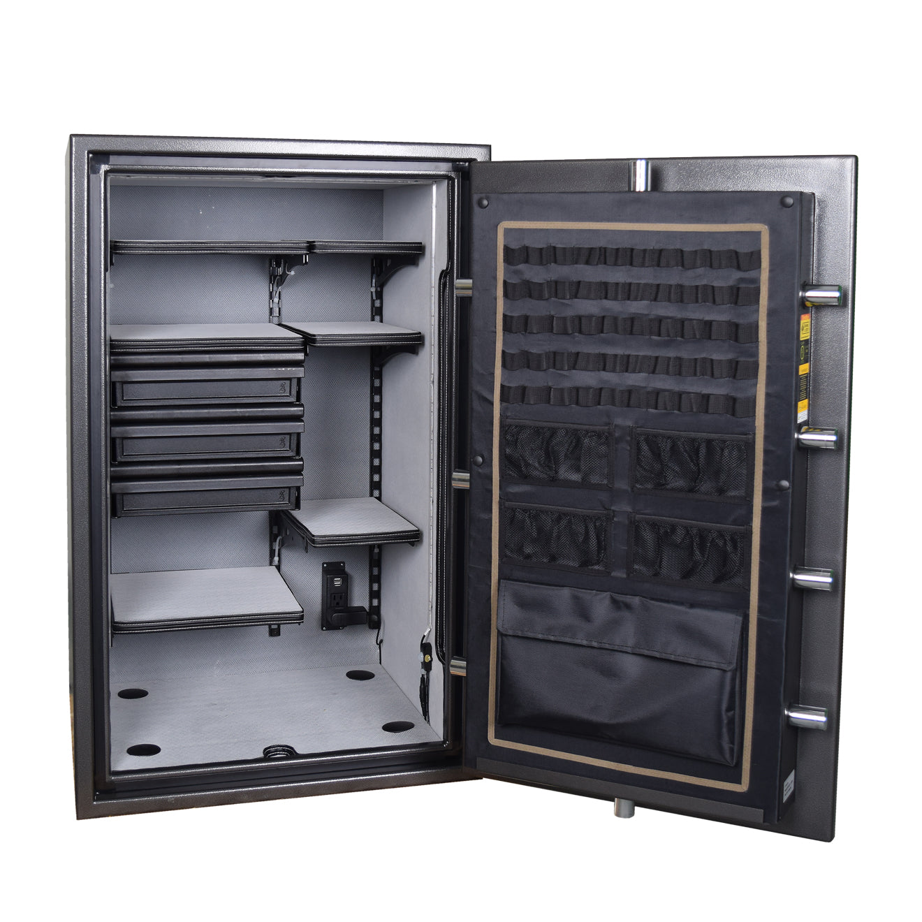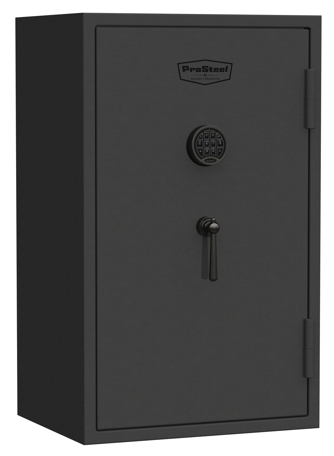 Travel freely while storing your valuables confidently. The ProSteel Deluxe Home safe offers top-of-the-line protection against theft or fire damage, thanks to its 10-Gauge steel body, UL® listed electronic lock, and a fire rating of 100 minutes at 1,680° (120 minutes at 1,200° F). Customize your shelving to conveniently store hand guns, passports, heirlooms, cash, and more. The interior includes 3 drawers and LED lighting.