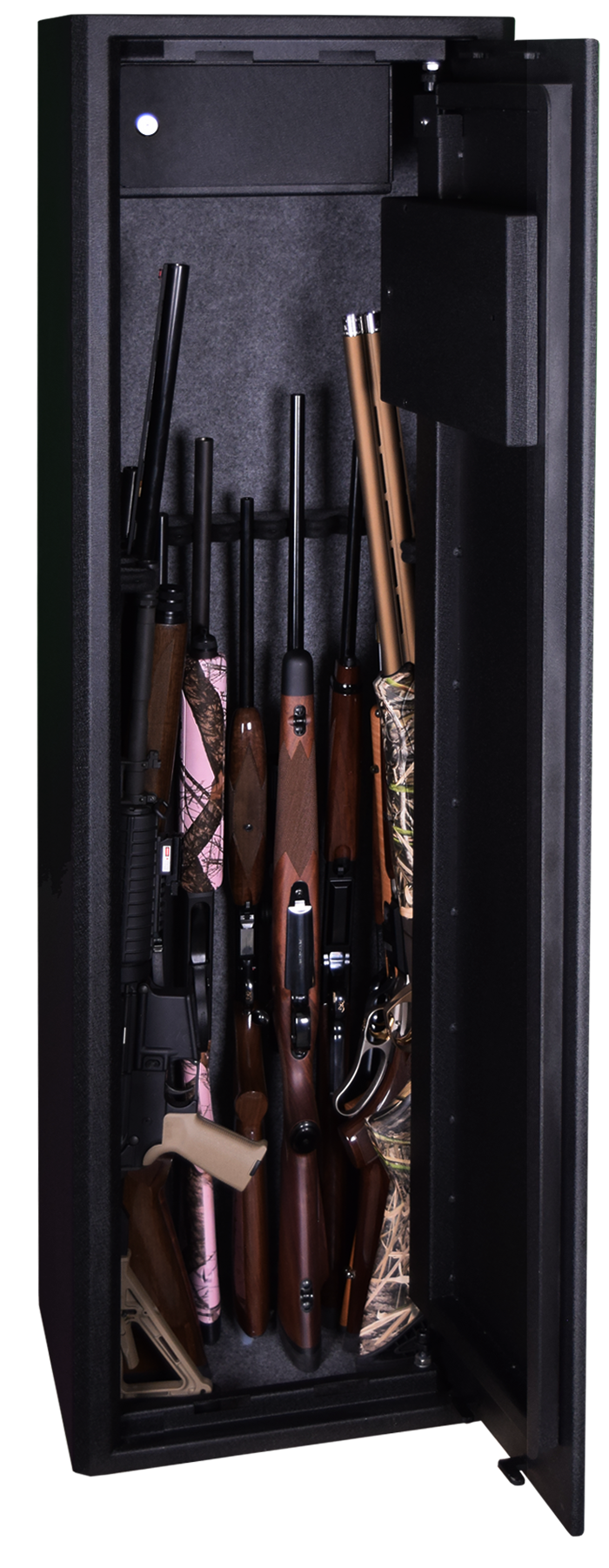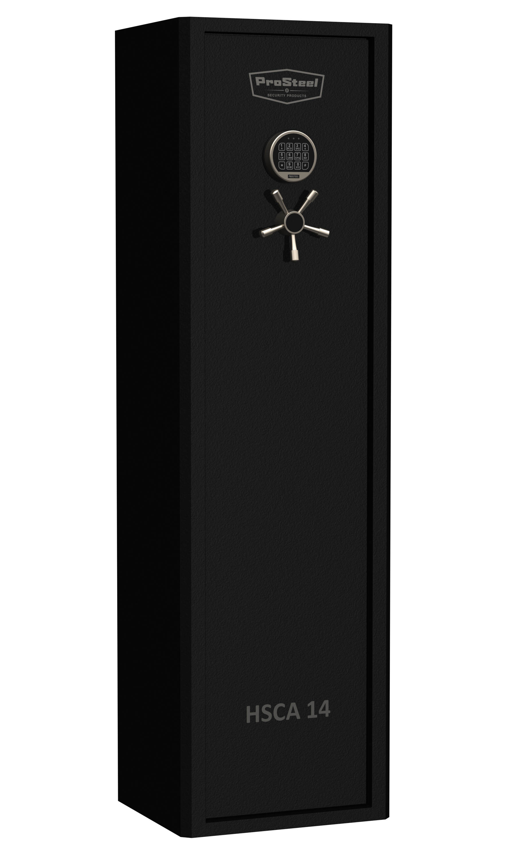 The HSCA14 has the patented Swing'N'Slide door system and features an electronic lock and 5-Spoke mini handle. The HSCA series also contains a key-lockable internal vault for ammunition or other valuables. The door is made from 13-gauge steel and the body is made from 16 gauge. Both edges are concealed entirely in the safe body and hardened steel latches connect the top and bottom of the door.